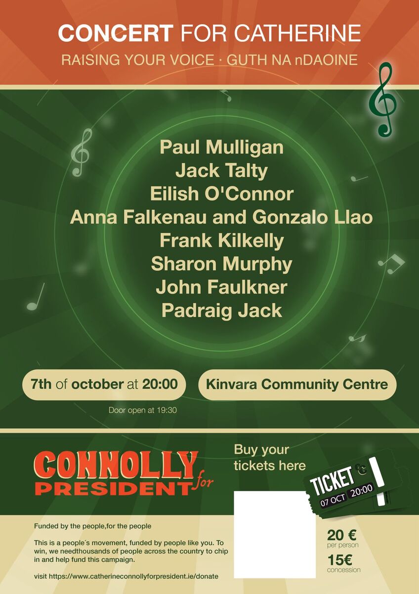 Join us October 7th at 8pm in the Kinvara Community Centre for a beautiful evening of music and entertainment to raise funds for Catherine Connolly's presidential campaign.